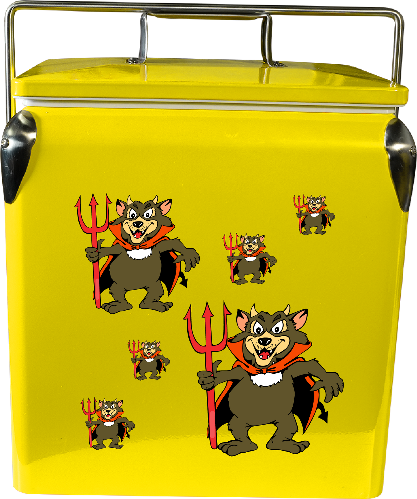 Featuring an iron sheet exterior with a powder-coated, glossy finish, and a food-grade PP plastic, leak-proof insulated liner for quick clean-up, the Devil Wears Cooler Box is designed with shiny chrome detailing, an integrated bottle opener, and the ability to accommodate 6 wine bottles in a vertical orientation. Additionally, it sports a chrome locking bar carry handle and a capacity of 17 litres. Available in Red, Black or White with New Colours now available for pre order Pink, Orange, Blue, Yellow and Green Makes a great Corporate present, gift for a loved one, or buy one for yourself.Why not add a logo to make yours truly unique?